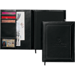 Genuine leather cover. 100 sheets of white elined paper. 7" x 9" bound journal refill. Pen loop. Business card holders. Mesh ID window. Black ribbon page marker.