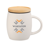 Cozy ceramic mug with matte finish body. Natural wooden lid also works as a coaster. Choose between color imprinting or our new cutting edge dishwasher safe laser decorating method. Leed's Exclusive. 15oz.