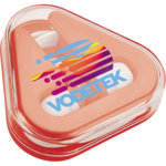 Use with any standard audio device. Triangle-shaped plastic case with cable storage. 3.5mm audio jack and 46-inch earbud cable.